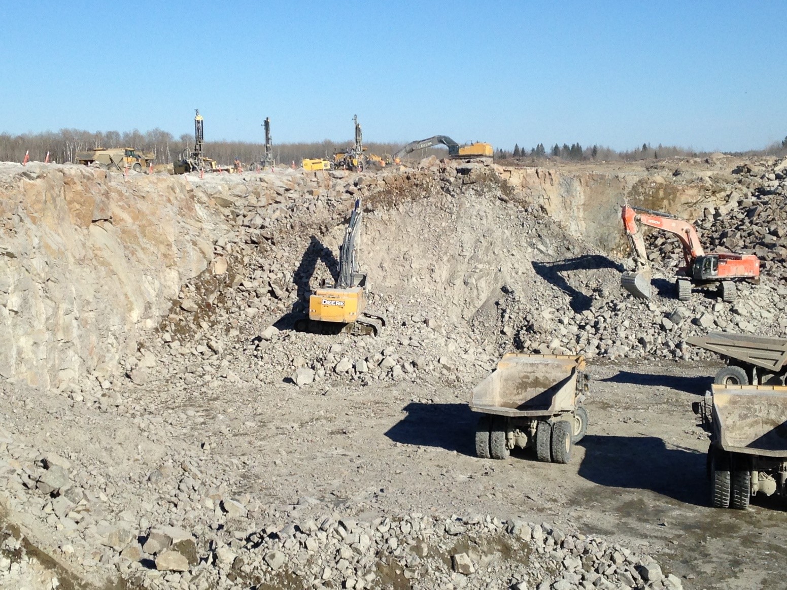 Description du projet : Une mine d’or du Nord-Ouest de l’Ontario a demandé des services complets de chargement et de tir par explosion pour excaver la roche à sa carrière adjacente afin de produire des matériaux de construction pour les routes, les digues et la plate-forme de concasseur. La mine a demandé que 1 500 000 m3 ou 4,35 millions de tonnes de roche granitique soient excavées dans un délai de 3,5 mois pour leurs besoins de construction. Ce travail a nécessité la présence d’un ingénieur de forage et de dynamitage sur place pour préparer les conceptions de souffles, séquencer les explosions, coordonner les équipes de décapage, de forage et de boue ainsi que superviser les opérations de chargement et assister aux réunions avec le client. Dyno Nobel a été choisi pour fournir tous les services de manutention et d’entreposage des explosifs, mais il avait besoin d’un ingénieur professionnel titulaire d’un permis d’ingénieur dans la province de l’Ontario pour terminer le travail de conception et de coordination. DynoConsult a été approché pour fournir 2 ingénieurs de site qui travailleraient sur une rotation fly-in de 14-14 jours fly-out pour effectuer cette tâche.