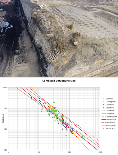 En collaboration avec la mine, DynoConsult a présenté un plan, a effectué une série d’explosions de trous de signature, a recueilli des données supplémentaires sur les vibrations des explosions régulières de la mine et a élaboré une caractérisation mise à jour de la réponse au sol. À partir de ce travail, ils ont montré les données de vibration précédentes et actuelles appariées, et ont permis la définition d’un nouveau facteur de distance à l’échelle modifiée. Ils ont aidé la mine à présenter le projet, les données sur les vibrations et les résultats au WY-DEQ. Le résultat a été l’approbation d’un facteur de distance à l’échelle modifiée pour la mine.